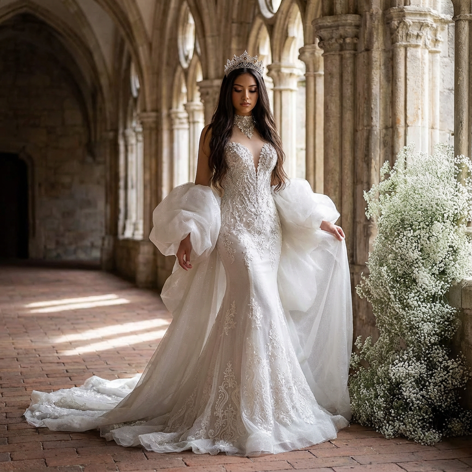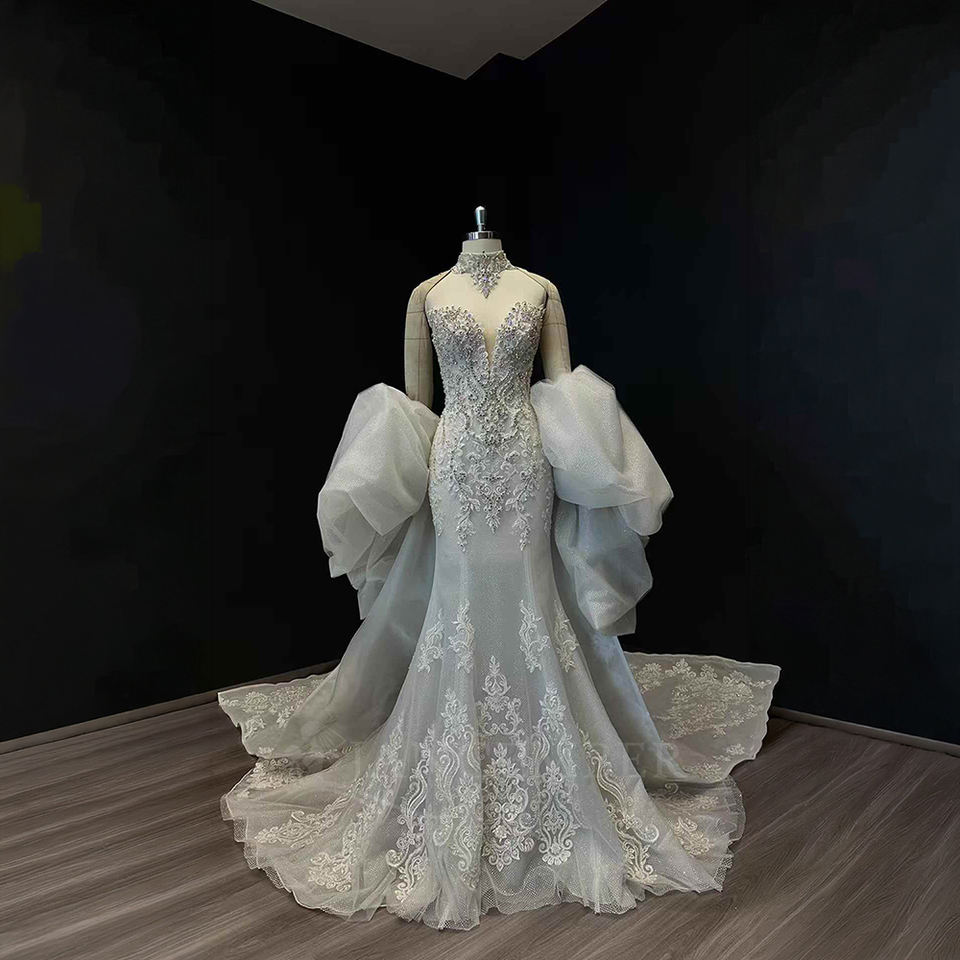 ชุดแต่งงานทรงบอลกาวน์ทันสมัยหรูหรา แขนพอง แต่งลูกไม้ประดับด้วยลูกปัด ชายกระโปรงยาวแบบชาเปล ดีไซน์เปิดหลัง ชุดเจ้าสาวสุดหรู