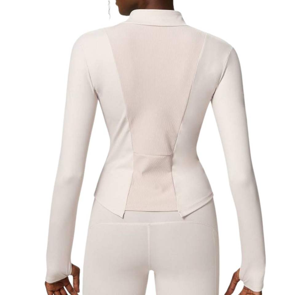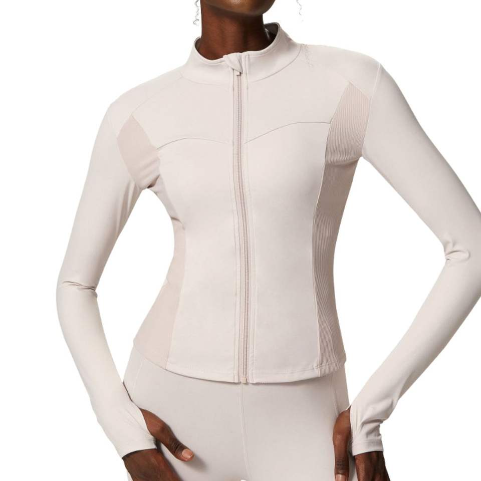 เสื้อแจ็คเก็ตโยคะสีเบจเนื้อผ้าบางเบา คอเต่า ทรงเข้ารูป ซิปยาว สำหรับผู้หญิง เหมาะสำหรับออกกำลังกายและเล่นกีฬา แขนยาว