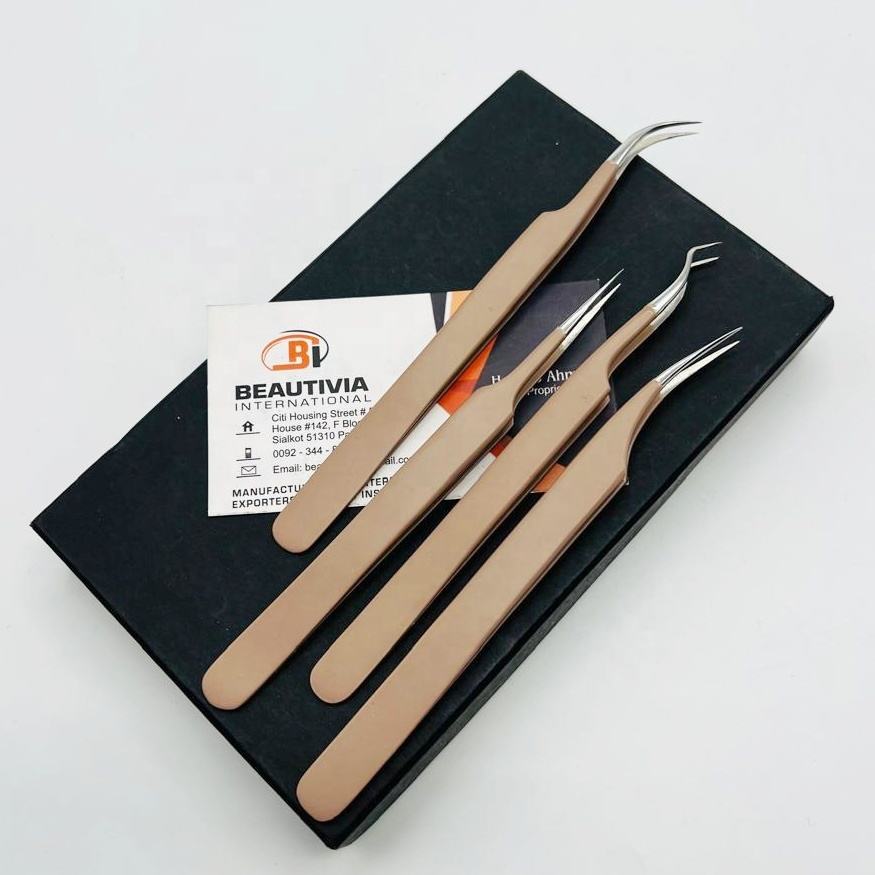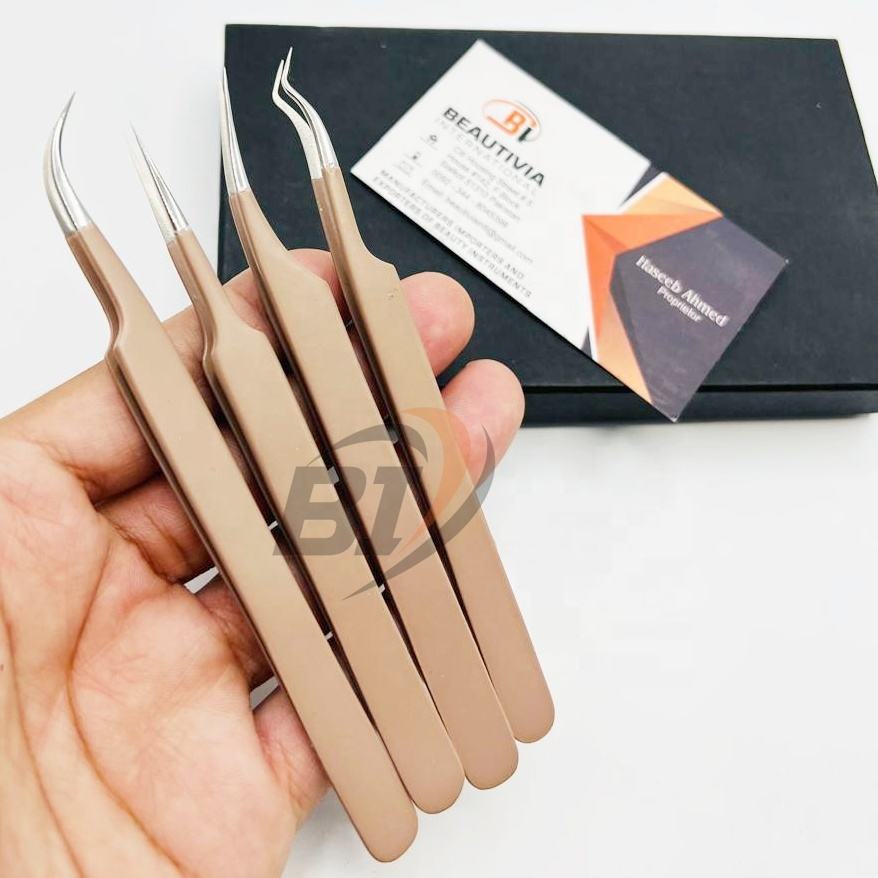 Nude Powder Coated Eyelash Extension Tweezers Custom Engraved Logo Heart Design Silver Stainless Steel with Fiber Tips