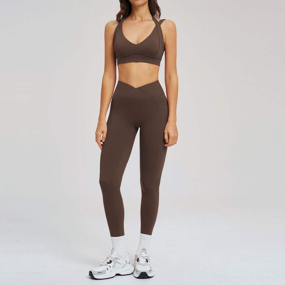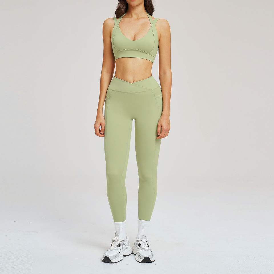 ชุดโยคะ เสื้อชั้นในกีฬาแบบเว้าคอวี กางเกงเลกกิ้งรัดรูปสำหรับออกกำลังกาย ชุดลำลองสำหรับวิ่ง ชุดโยคะแห้งเร็วสำหรับผู้หญิง