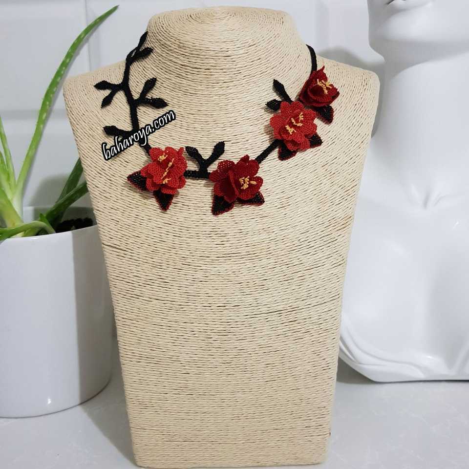 Nurgül kolye No. 2 İne oyasigh narçiçeği kırmızigh (siyah bant)-Moda kolye