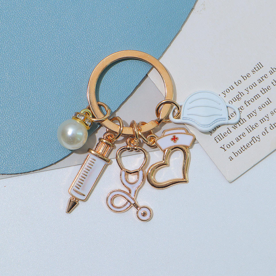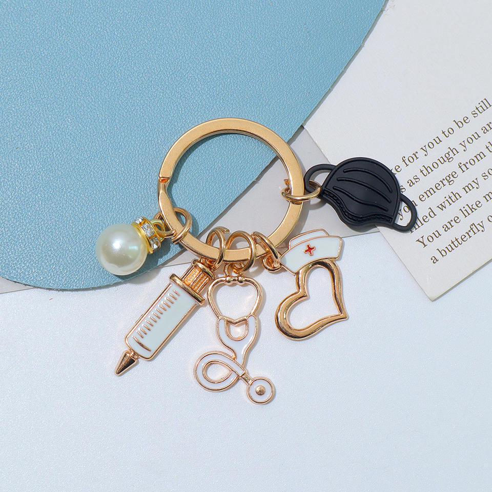 พวงกุญแจโลหะของแพทย์พยาบาลพวงกุญแจโลหะสังกะสีอัลลอยด์มุกหน้ากากทางการแพทย์เข็มฉีดยาเข็มฉีดยารูปหัวใจพวงกุญแจจี้