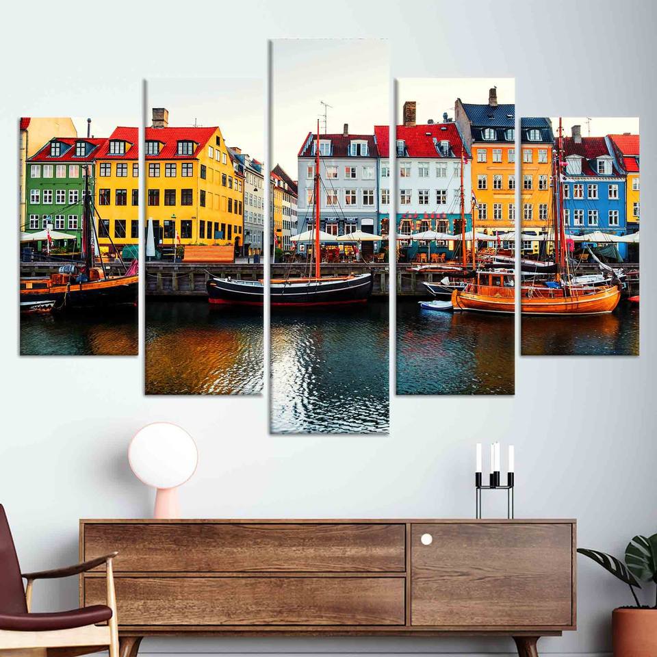 ภาพพิมพ์บนผ้าใบเนยฮาวน์ เดนมาร์ก: ฉากท่าเรือโคเปนเฮเกนที่มีชีวิตชีวา ชุดผ้าใบผสม 5 ชิ้น