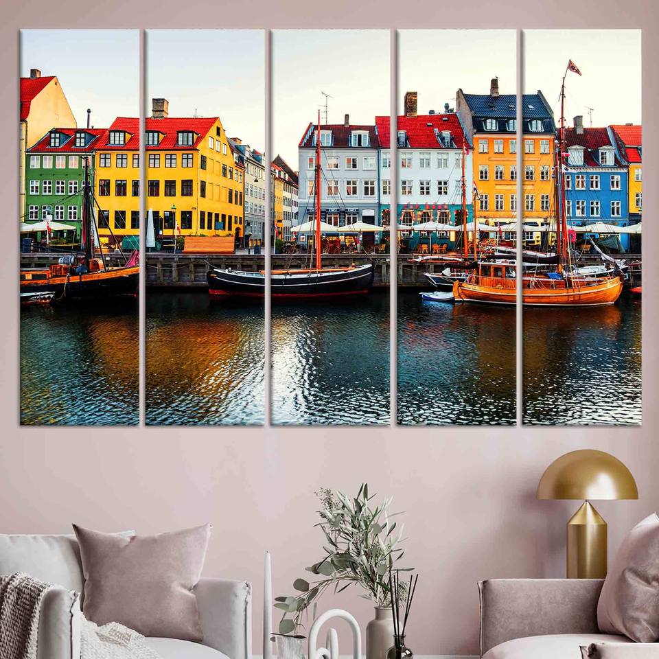 ภาพพิมพ์บนผ้าใบนิฮาวน์ เดนมาร์ก: ฉากท่าเรือโคเปนเฮเกนที่มีชีวิตชีวา ชุดผ้าใบ 5 ชิ้น