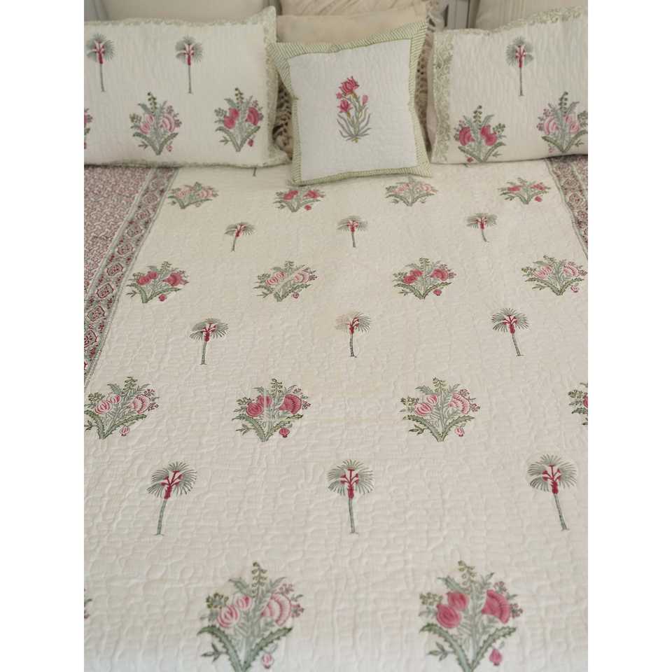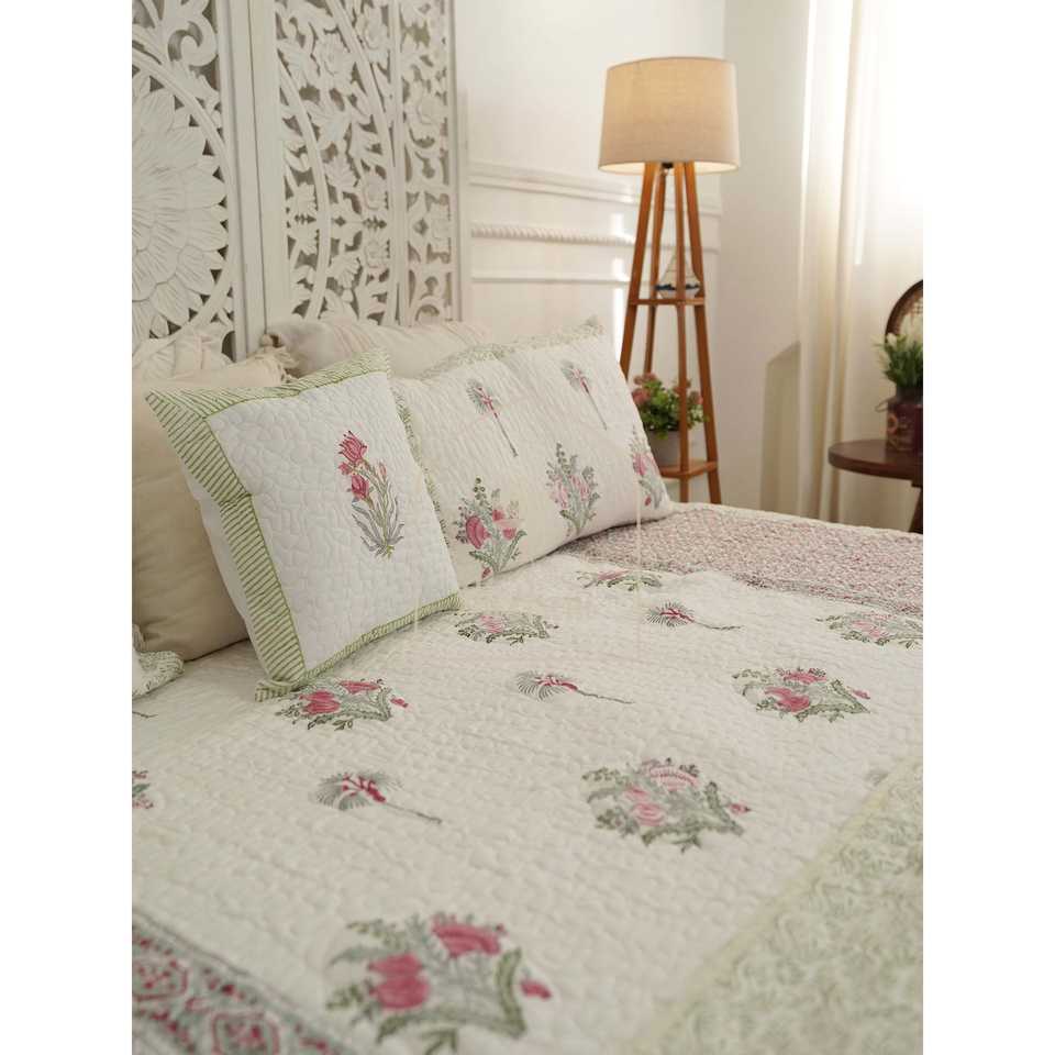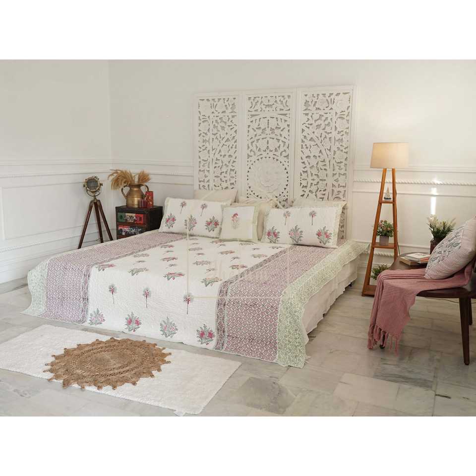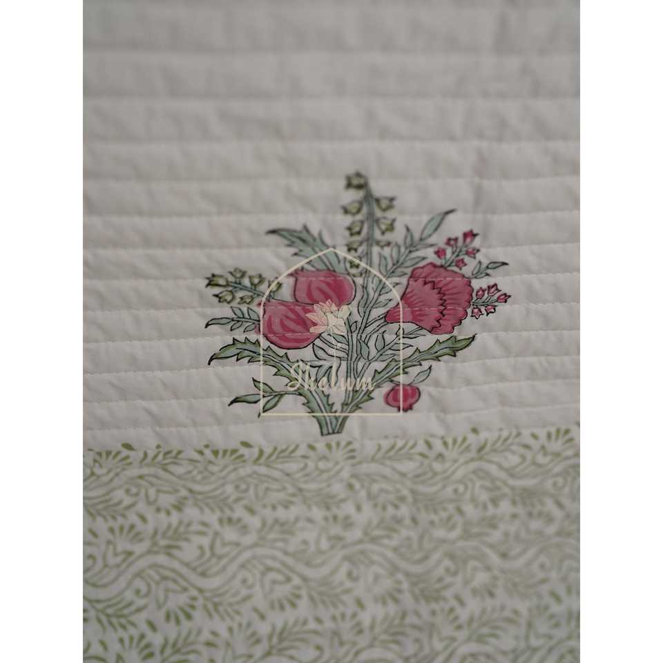 Nyla Premium Bedspread-Twilight Petals Handmade Cotton Block Printed Floral Quilted Soft Hand Embroidered for Home for Hotels