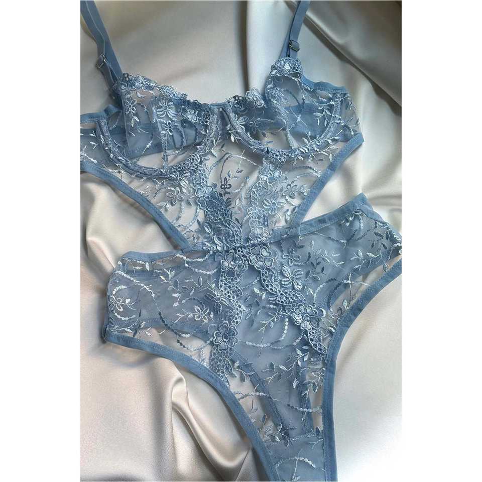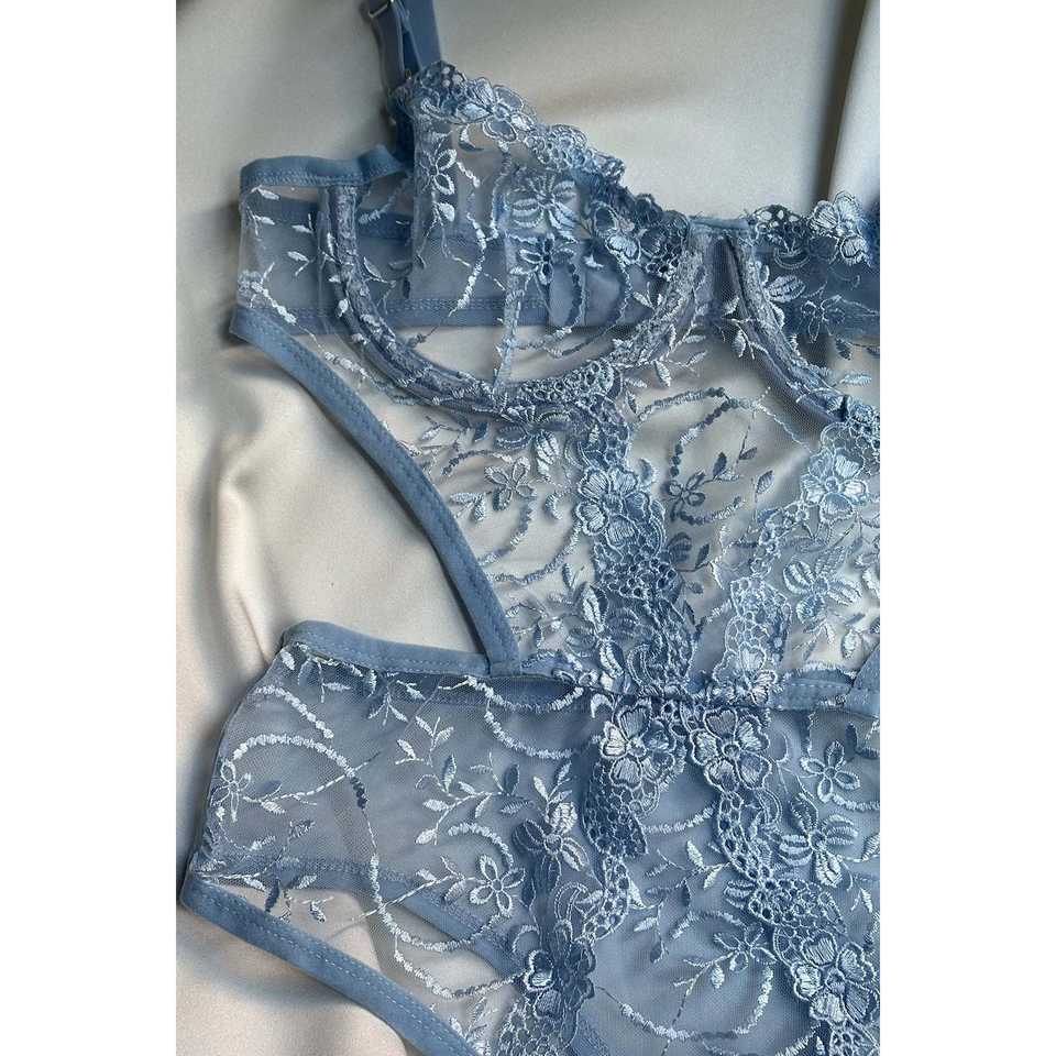 ชุดบอดี้สูทไนลอนสีน้ำเงินพร้อมลายพิมพ์และรายละเอียดลูกไม้ ความยาวเหนือเข่า