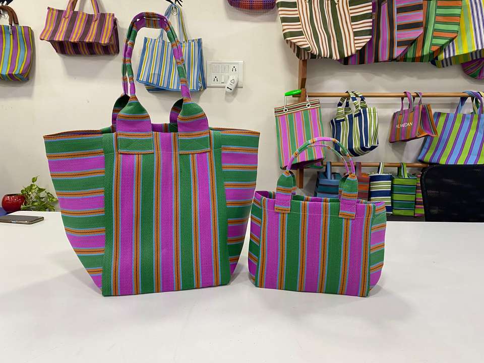กระเป๋าช้อปปิ้งลายทางทำจากโพลีโพรพิลีนรีไซเคิลได้อย่างยั่งยืนผ้าไนลอนเป็นมิตรกับสิ่งแวดล้อมผลิตจากอินเดียรีไซเคิล