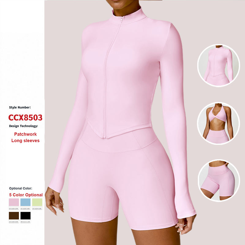 ชุดโยคะออกกำลังกายผู้หญิง ผ้าไนลอน ยืดหยุ่นสูง เสื้อแจ็คเก็ตแขนยาวสำหรับเล่นกีฬา ชุดออกกำลังกาย กางเกงเลกกิ้งเอวสูง กางเกงขาสั้น