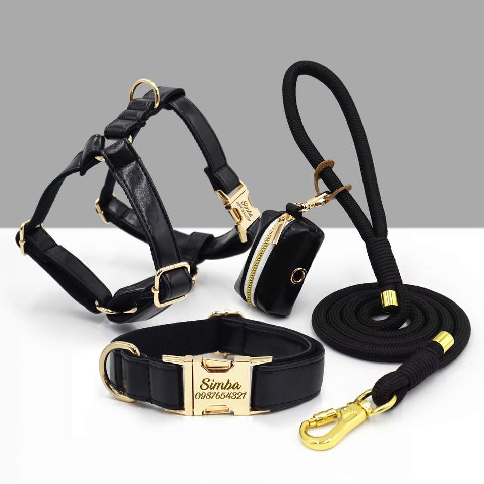 ปลอกคอ/สายจูง/สายรัด/ถุงเก็บอุจจาระสุนัขบุไนลอน สีดำ หัวเข็มขัดโลหะสลักลาย ตกแต่งหมุด ของขวัญสำหรับลูกสุนัขในงานแต่งงาน ออสเตรเลีย