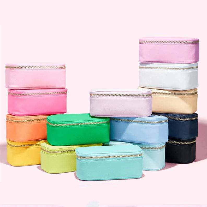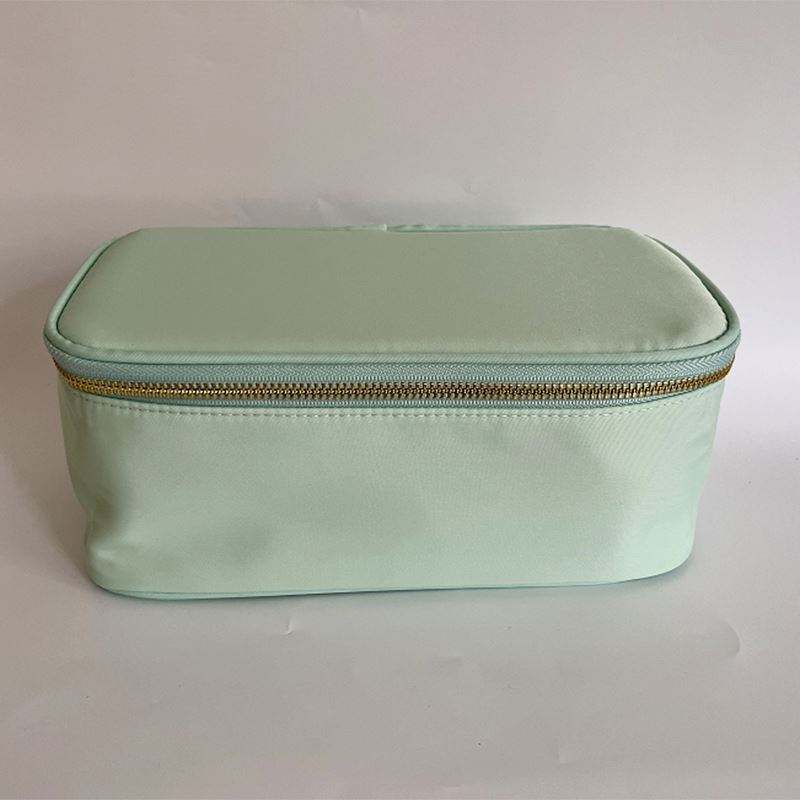 กระเป๋าเครื่องสำอางแบบเปิดด้านบนสำหรับผู้หญิง พร้อมซิปกันน้ำทำจากไนลอน ตกแต่งด้วยป้ายตัวอักษรแบบกำหนดเองได้