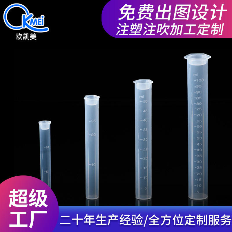 หลอดวัดสีพลาสติก O'Kayme ขนาด 10 มล. 25 มล. 50 มล. 100 มล. โพลีโพรพิลีนแบบมีขีดบอกปริมาตร ก้นแบน พร้อมฝาปิดแบบกด