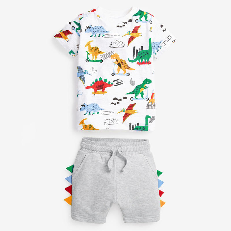 ชุดฤดูร้อนเด็กผู้ชายลายไดโนเสาร์ ผ้าฝ้าย 100% แบบ OEM ODM พร้อมส่งภายใน 60 วัน เสื้อยืดแขนสั้น กางเกงขาสั้น ชุด 2 ชิ้น ชุดฤดูร้อนเด็กผู้ชาย
