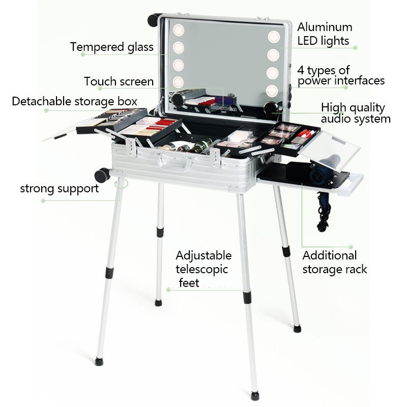 Obox กล่องเครื่องสำอางกล่องแต่งหน้าพร้อมกระจกไฟ LED บลูทูธสำหรับช่างแต่งหน้ามืออาชีพอุปกรณ์ตัดผม