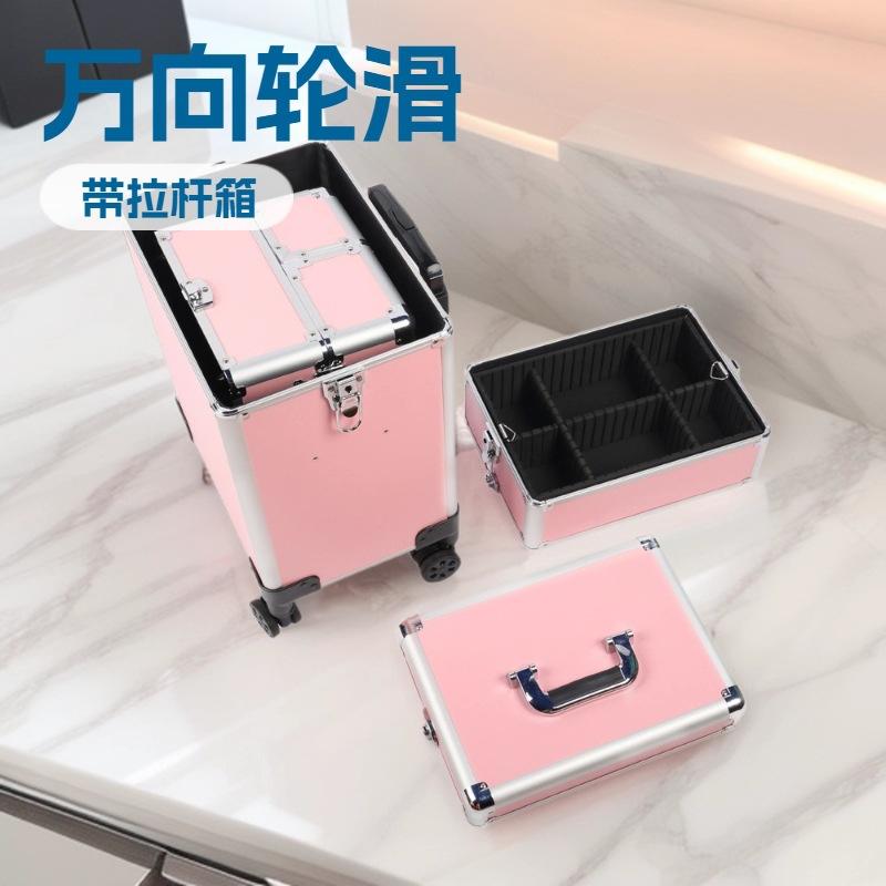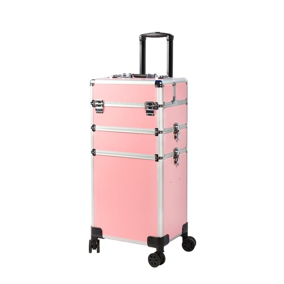 กระเป๋าเครื่องสำอางแบบมีล้อลาก OBOX Professional สีชมพู-ดำ 4 ล้อ ล็อคได้ กล่องเก็บของสำหรับร้านเสริมสวย เคลื่อนย้ายง่ายด้วยล้อหมุน