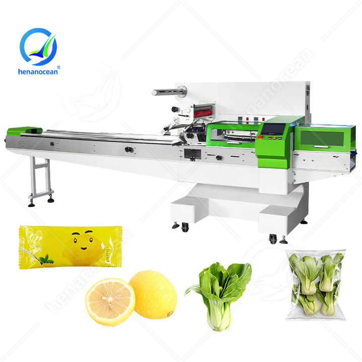 เครื่องแพ็คเก็จผักและผลไม้แนวนอนทรงหมอนผักโขมสดส้มมหาสมุทร