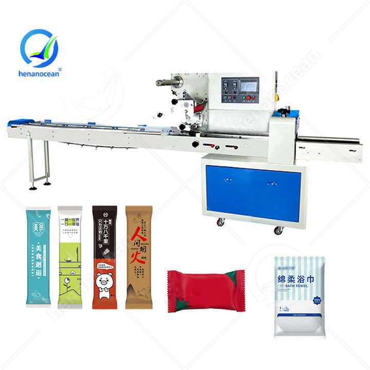 เครื่องแพ็คห่อกระดาษเช็ดมือแนวนอนมหาสมุทรมีถุงหมอนชุดช้อนส้อมสบู่ไหลอัตโนมัติ