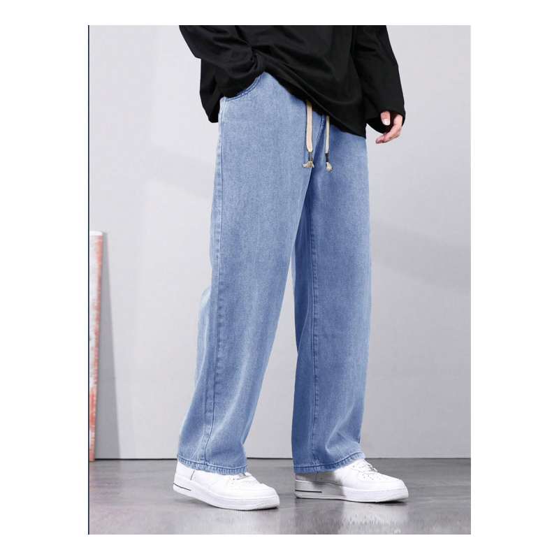 กางเกงยีนส์ลำลองผู้ชายแบบ ODM ผลิตตามสั่ง เป็นมิตรกับสิ่งแวดล้อม น้ำหนักเบา สีน้ำเงินล้วน สไตล์สตรีทแวร์ ทรงหลวม ตรง ทอแบบถัก ผ่านกระบวนการซัก