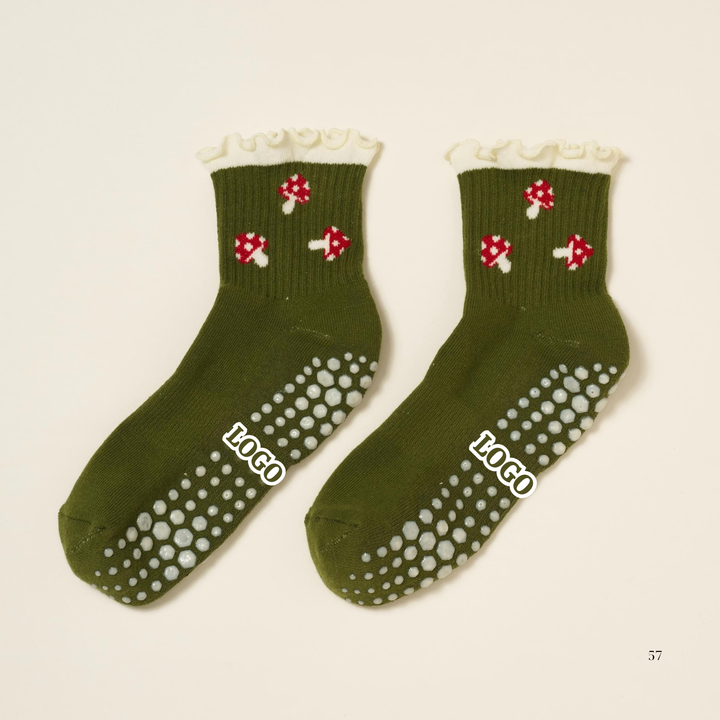 ถุงเท้าพิลาทิส ODM แบบกำหนดเอง ลายเห็ด ดีไซน์ระบายอากาศ กันลื่น ผลิตจากผ้าฝ้าย เป็นมิตรกับสิ่งแวดล้อม แห้งเร็ว เหมาะสำหรับใส่ในบ้านช่วงฤดูใบไม้ร่วง