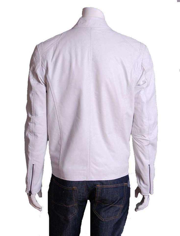 โรงงานผลิตแจ็คเก็ตหนัง ODM แจ็คเก็ตหนังผู้ชายสไตล์ไบค์เกอร์สีขาว พร้อมโลโก้ปัก แจ็คเก็ตหนังแท้จากปากีสถาน