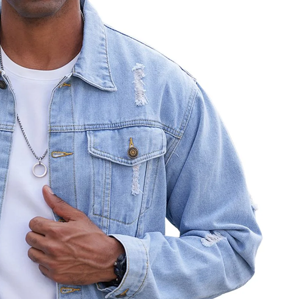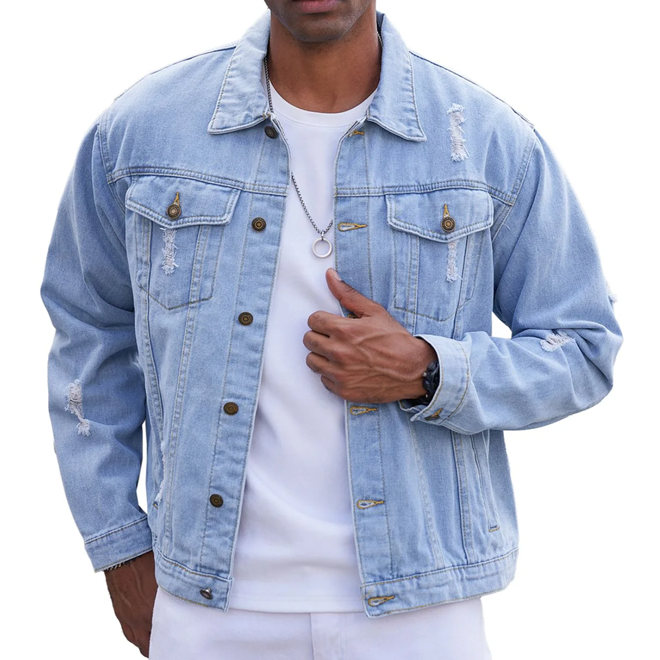ODM แจ็คเก็ตยีนส์ผู้ชายกันลมสไตล์วินเทจพิมพ์ลายคอตั้งโลโก้สตรีทแวร์