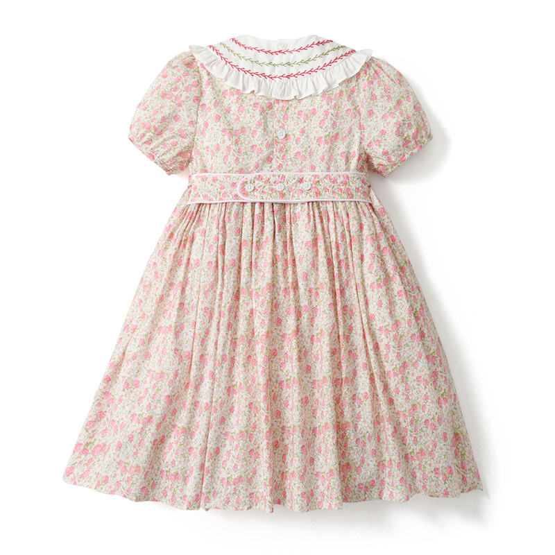 ชุดเดรสเด็กผู้หญิงทรงเอไลน์ ความยาวระดับเข่า ผ้าฝ้ายพิมพ์ลายดอกไม้สไตล์ลิเบอร์ตี้ สำหรับฤดูร้อน ผลิตแบบ ODM OEM งานปักมือ สม็อค ระบายอากาศได้ดี เป็นมิตรกับสิ่งแวดล้อม