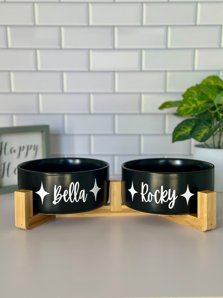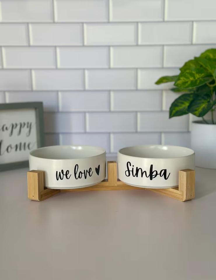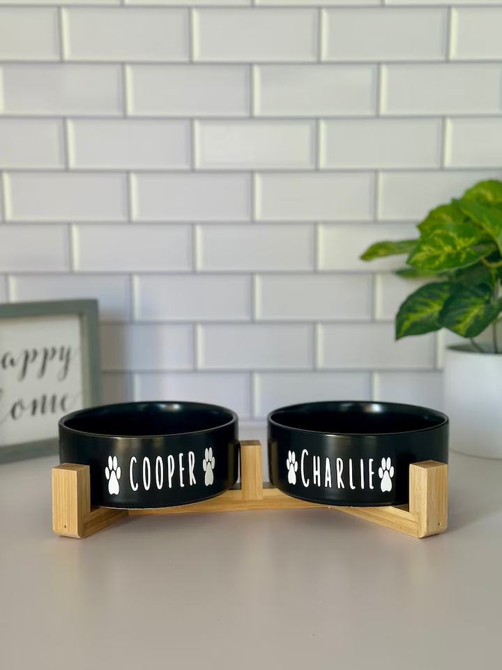 ODM OEM ชุดชามอาหารสุนัขเซรามิกแบบกำหนดเองพร้อมแท่นไม้ยกสูงของขวัญส่วนบุคคลสำหรับเจ้าของสุนัขแหล่งชาร์จ