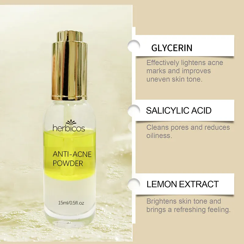 ODM/OEM เซรั่มสองชั้นสำหรับผิวหน้าสิวทำให้สิวสว่างขึ้นผลิตภัณฑ์รักษาสิวผลิตภัณฑ์รักษาสิวผงเซรั่มน้ำ