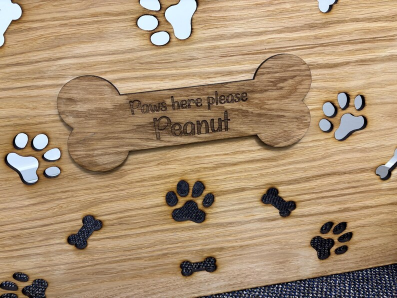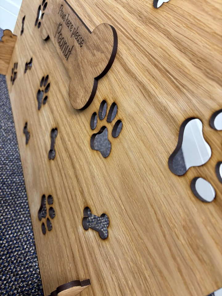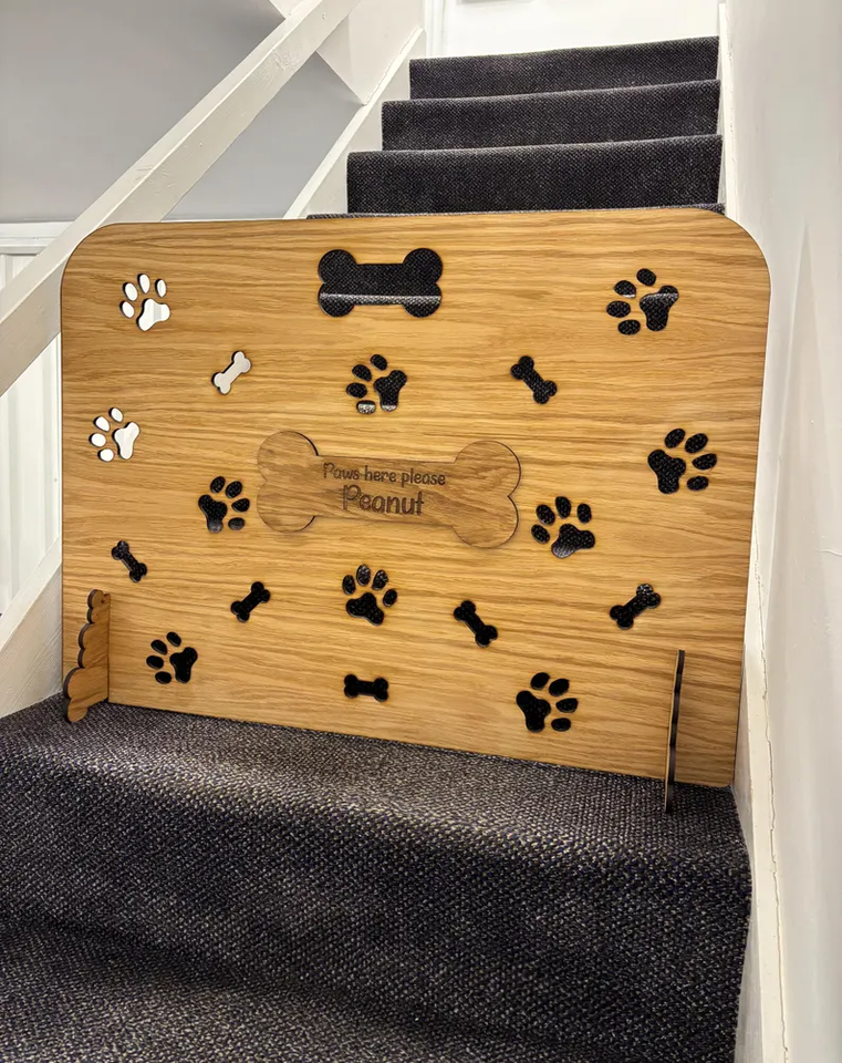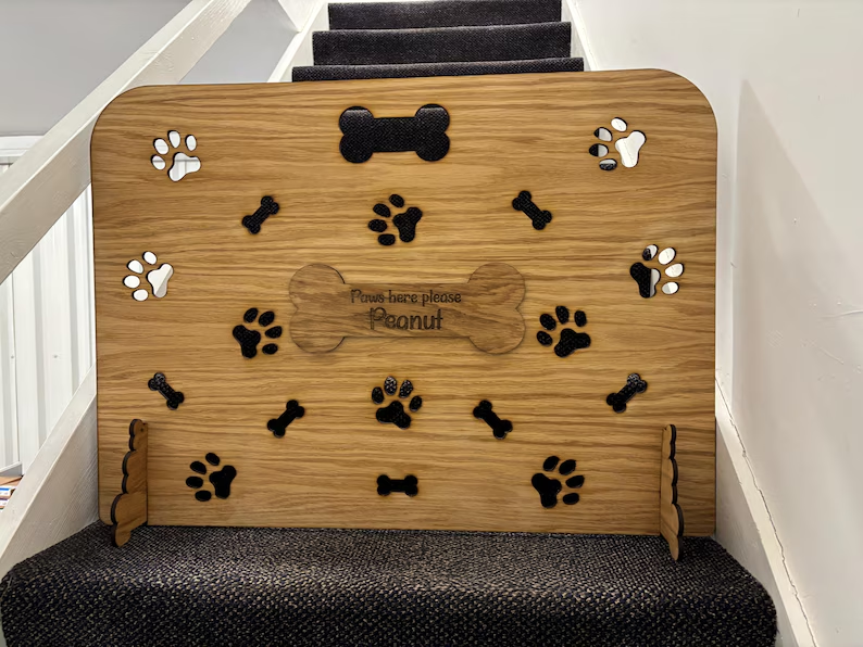 ประตูกั้นบันไดสำหรับสัตว์เลี้ยงแบบ ODM OEM วัสดุไม้โอ๊ควีเนียร์บนแผ่น MDF ตัดด้วยเลเซอร์ ดีไซน์ทันสมัย ของขวัญสำหรับสุนัขและแมว