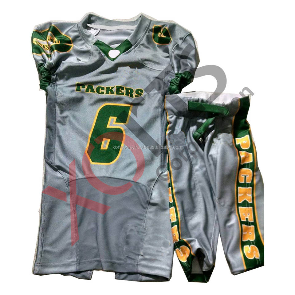 บริการ ODM OEM ชุดยูนิฟอร์มอเมริกันฟุตบอลสีเขียวทองแบบสั่งทำพิเศษ แห้งเร็ว ระบายอากาศได้ดี พิมพ์ลายแบบ Sublimation ขายส่ง
