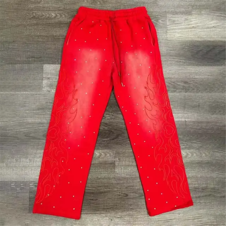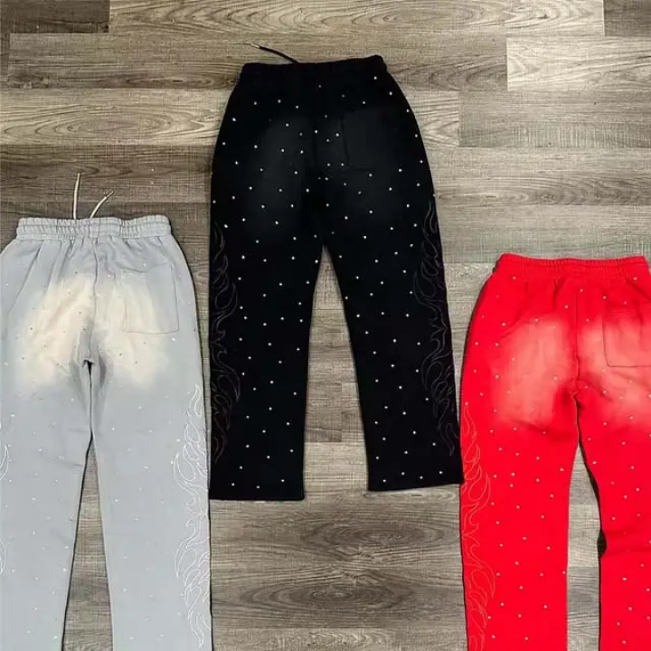 ODM Streetwear Men's Cotton Rhinestone Spray Wash DTG Sticker Trouser Pants Jogger Sweat Flared Pant Men Breathable Track Pants