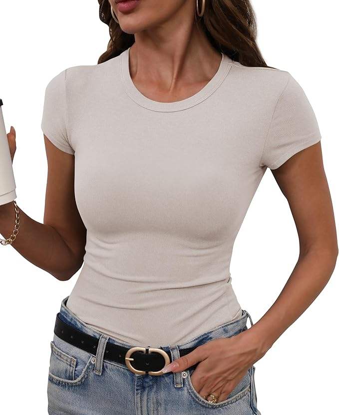 เสื้อยืดคอกลมแขนสั้นสำหรับผู้หญิง ODM เสื้อยืดออกกำลังกายเข้ารูปลำลองแบบเต็มตัวออกแบบโลโก้ได้ตามที่ต้องการ