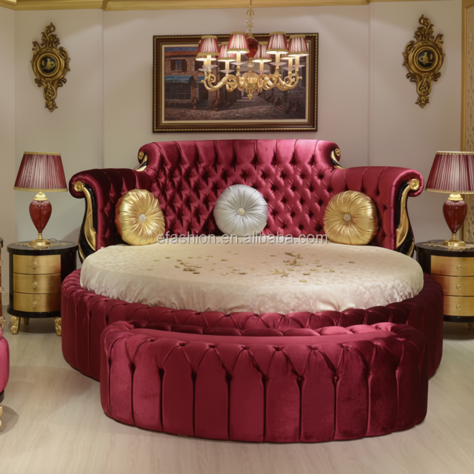 เตียงทรงกลมผ้ากำมะหยี่สีแดงเบอร์กันดีสไตล์วินเทจ รุ่น OE-FASHION โครงไม้แกะสลักสีดำทอง พร้อมออตโตมัน