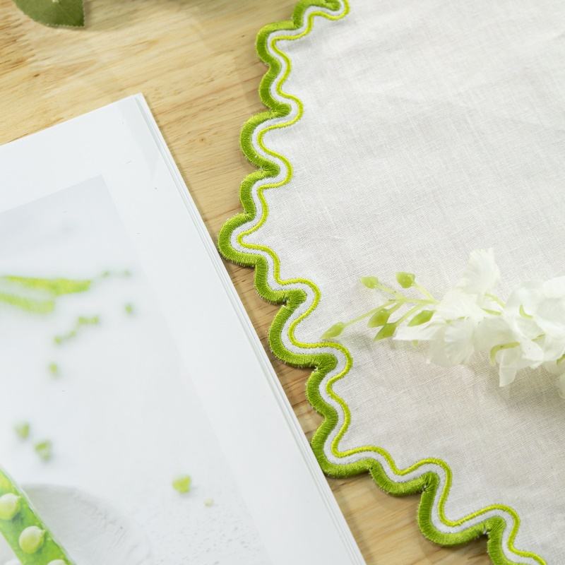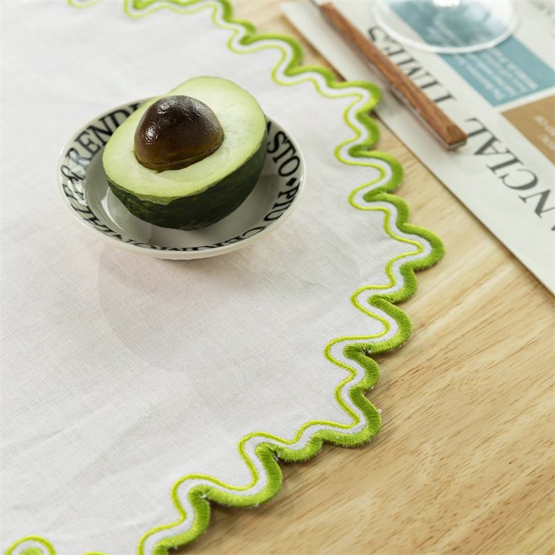 ชุดผ้ารองจานปักลายหรูหรา ได้รับการรับรองมาตรฐาน OEKO-TEX ผลิตจากผ้าฝ้ายลินินแบบกำหนดเอง ดีไซน์ขอบหยักแบบไม่สม่ำเสมอ ใช้ซ้ำได้ ปลอดภัยสำหรับผู้แพ้ง่าย