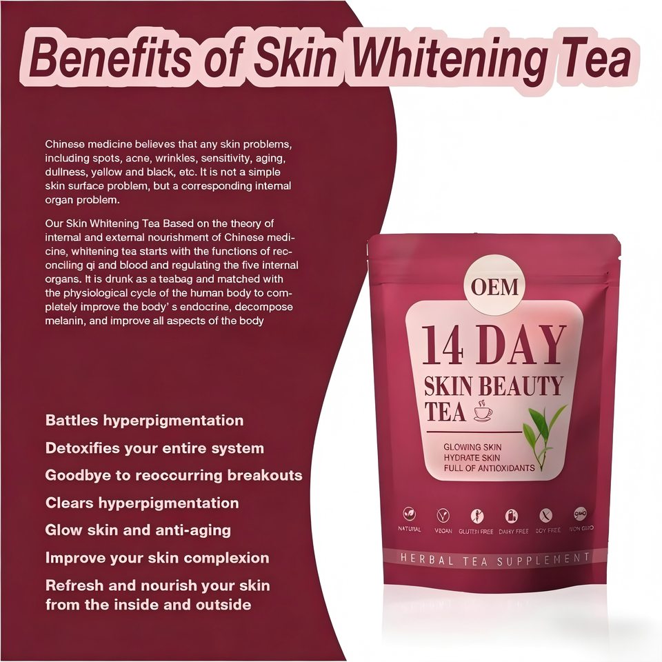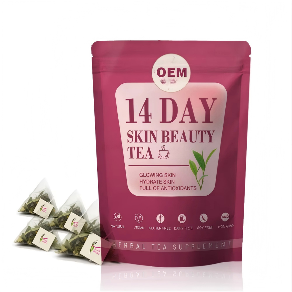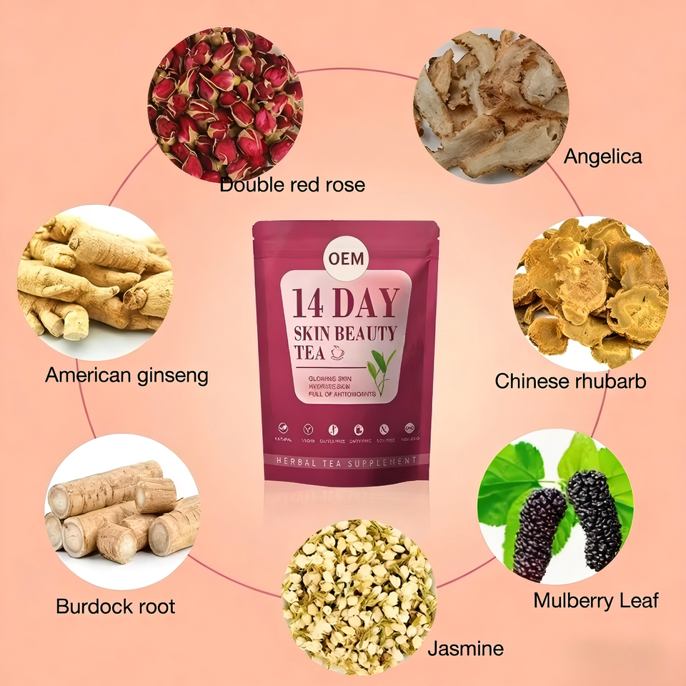 ชาบำรุงผิว OEM 14 วัน ช่วยให้ผิวเปล่งประกาย ชุ่มชื้น อุดมด้วยสารต้านอนุมูลอิสระ จากดอกแองเจลิก้า โสม และบาร์ด็อค ผลิตภัณฑ์ธรรมชาติ มังสวิรัติ ออร์แกนิค ได้รับการรับรองจาก USDA บรรจุกล่อง 14 ซอง