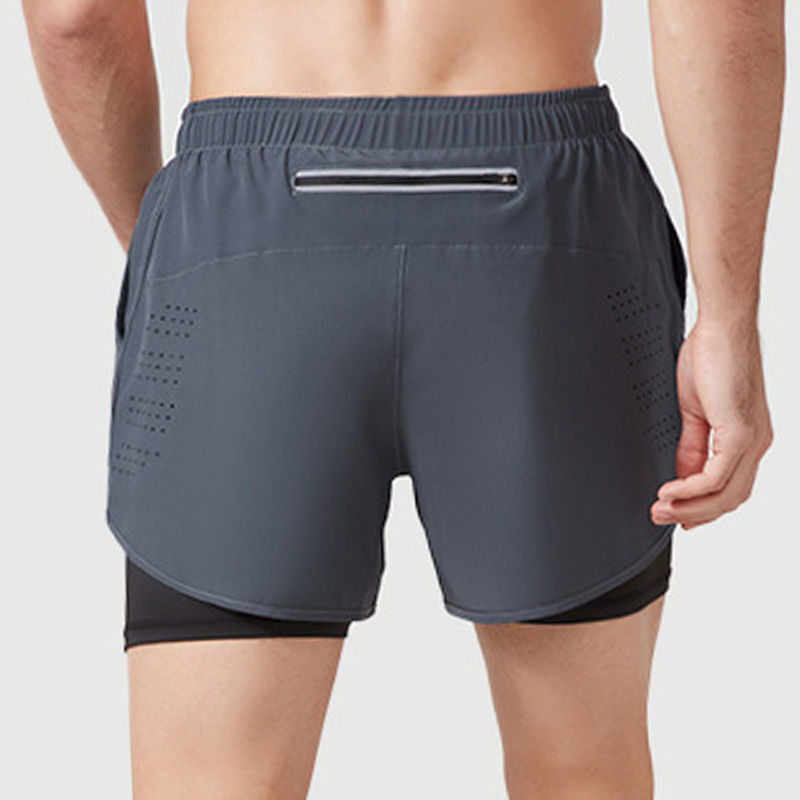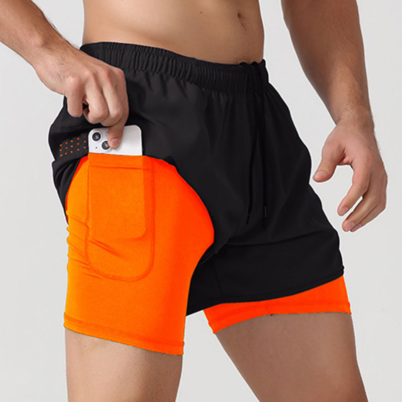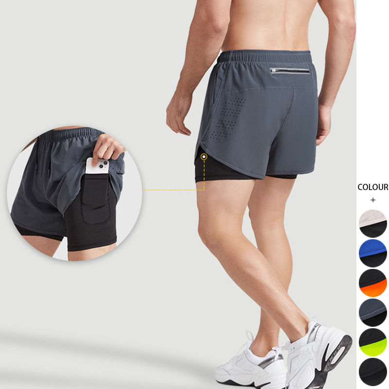 กางเกงขาสั้นวิ่งของผู้ชายแบบ2 in 1 OEM กางเกงขาสั้นไนลอนสำหรับออกกำลังกายสองชั้นพร้อมกระเป๋าใส่ของ | โลโก้ผู้ผลิตชุดกีฬาตามสั่ง
