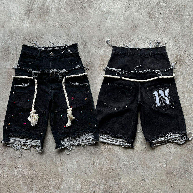 กางเกงยีนส์ขาสั้น OEM 2026 พิมพ์ลายคริสตัลแบบกำหนดเอง กางเกงยีนส์ทรงหลวมสไตล์วินเทจ เอวสองชั้น ระบายอากาศได้ดี ปักลาย กางเกงคาร์โก้สำหรับผู้ชาย