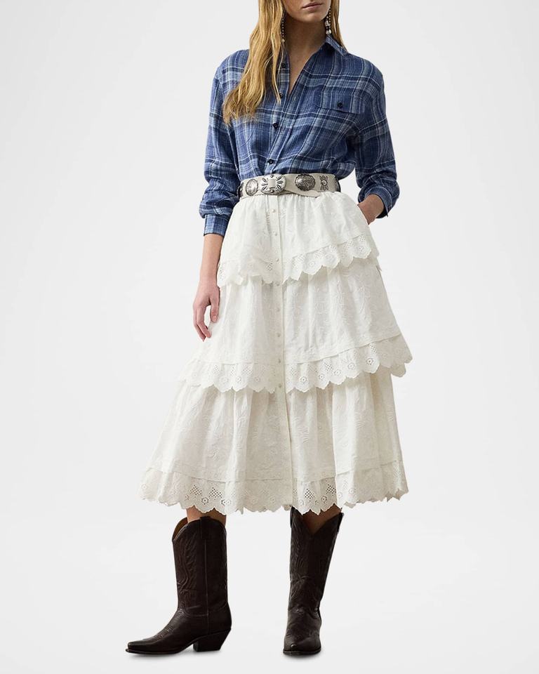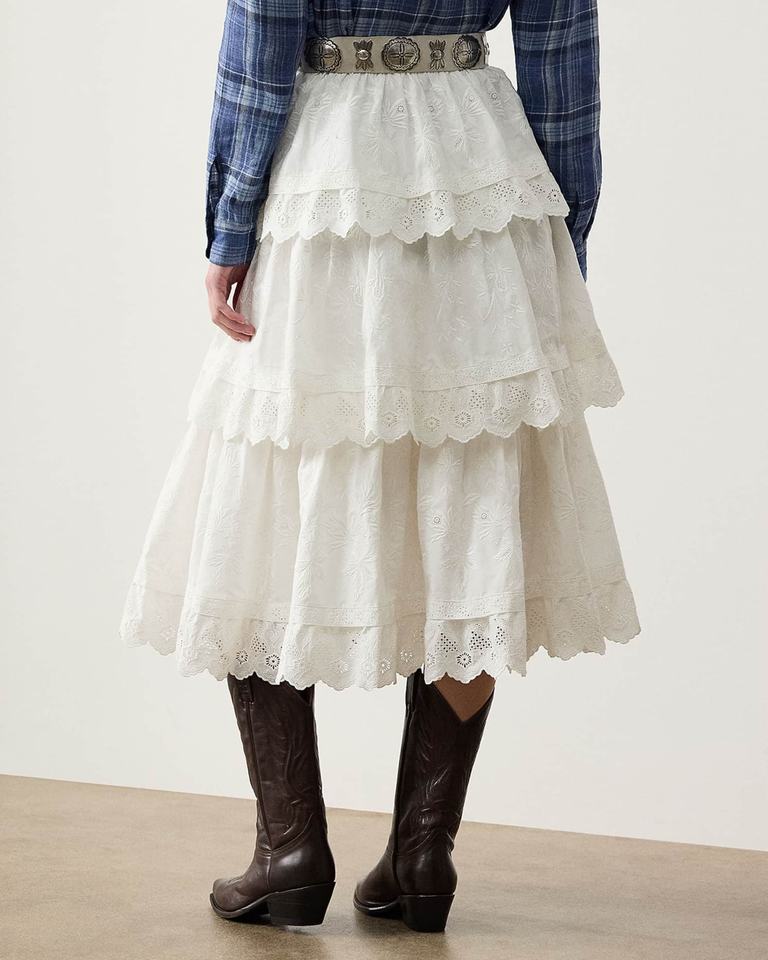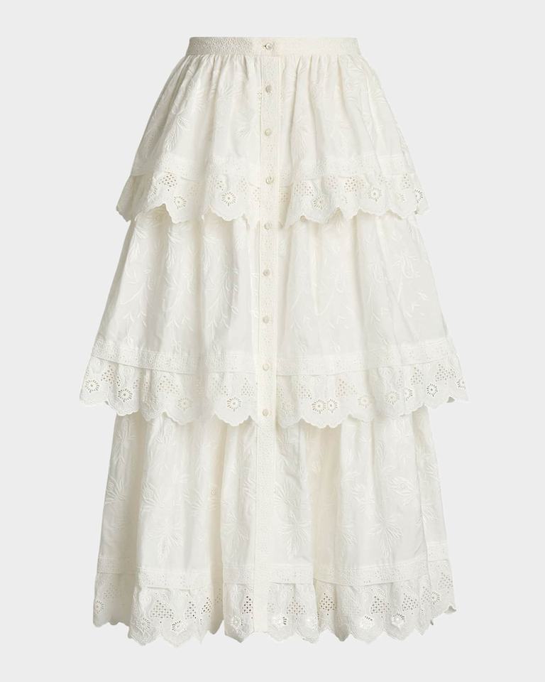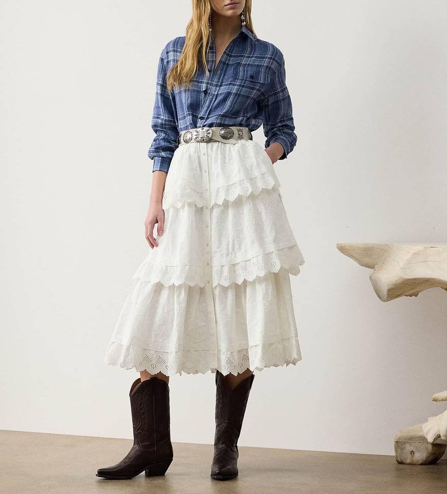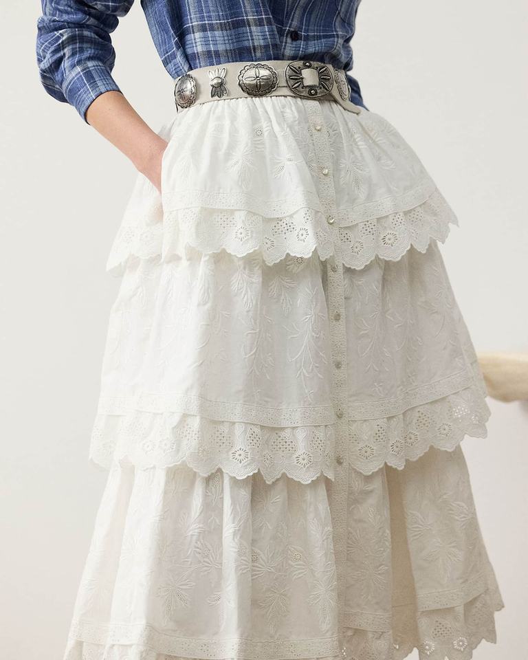 กระโปรงเรียงเป็นชั้นสไตล์ฝรั่งเศสหรูหราปานกลางระบายอากาศได้ดีตาไก่ผ้าฝ้ายปักลายดอกไม้แบบลำลองสำหรับฤดูร้อนของ2026