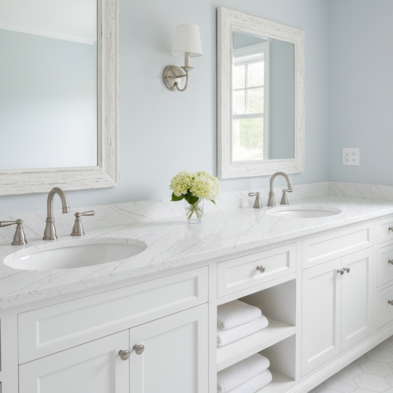 แผ่นหินเทียม20มม. 30มม. เคาน์เตอร์หินอ่อนควอตซ์สีขาวหรูหราหรูหราสำหรับโต๊ะเครื่องแป้งท็อปครัวเกาะผนังโรงแรม