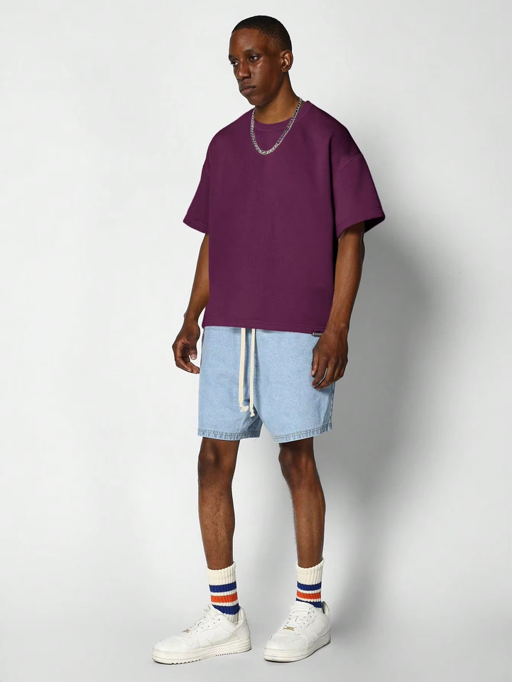 เสื้อยืดคอตตอน/โพลีเอสเตอร์สะพายไหล่ทรงโอเวอร์ไซส์สำหรับผู้ชายลายสีพื้น240กรัม300 GSM