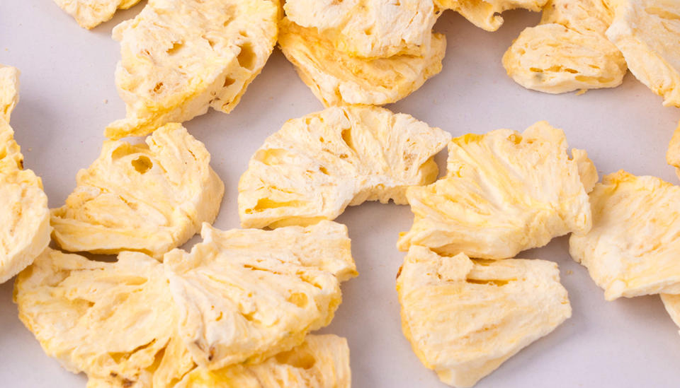 ชิปสับปะรดอบแห้งแช่แข็งขนาด50กก. สีเหลืองอ่อนหั่นบางๆรสหวานพร้อมรสชาติบรรจุภัณฑ์จำนวนมากกระบวนการอบแห้งแบบแช่แข็ง