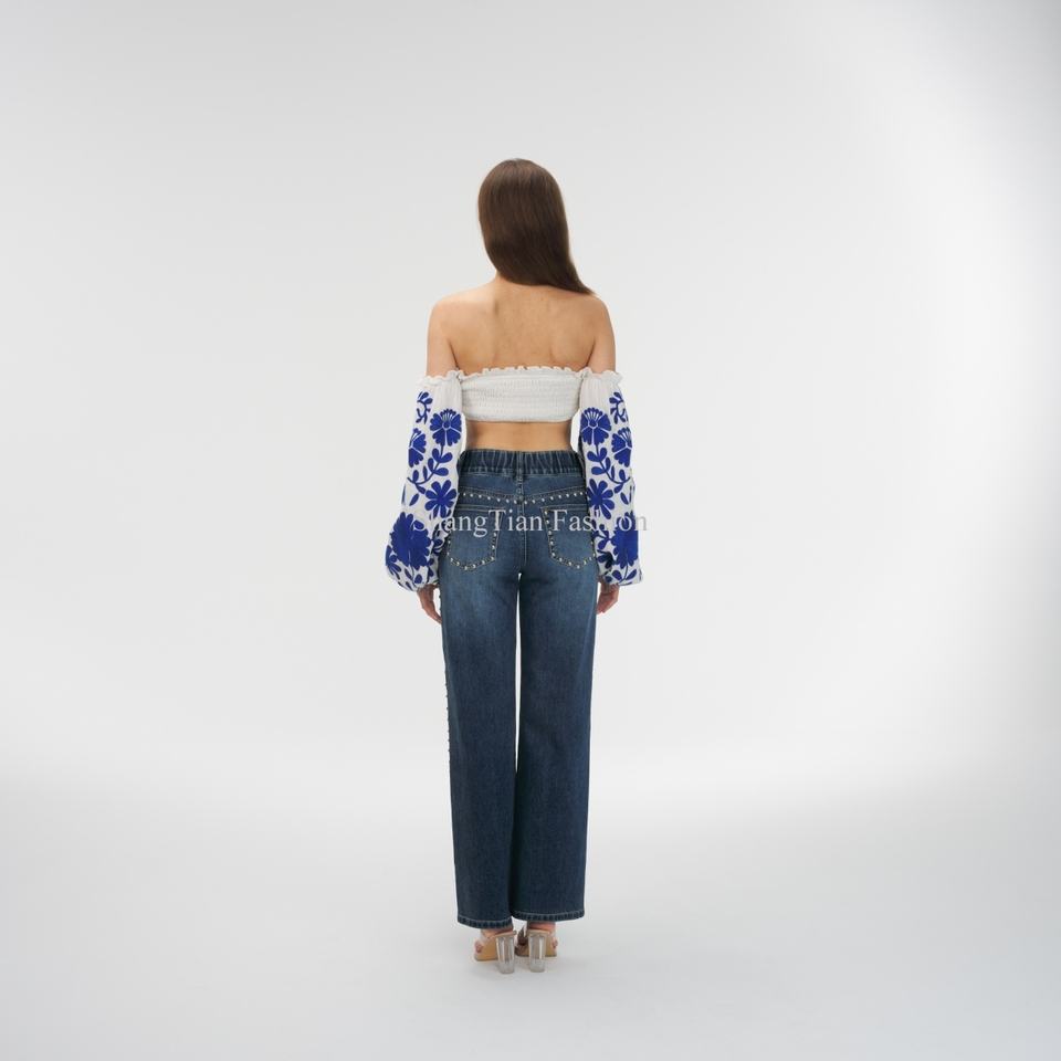 กางเกงยีนส์วินเทจทรงเอวสูงแบบขาดๆ สไตล์ OEM ล้างสีแบบแอซิดวอช สำหรับผู้หญิง