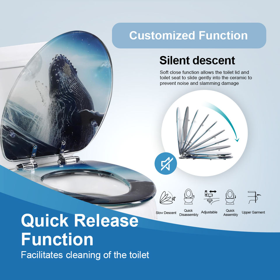 ที่นั่งโถส้วมรูปปลาวาฬทำจากอะคริลิกสติกเกอร์ฝาชักโครกลาย3D บานพับโลหะปรับได้สำหรับห้องน้ำสมัยใหม่