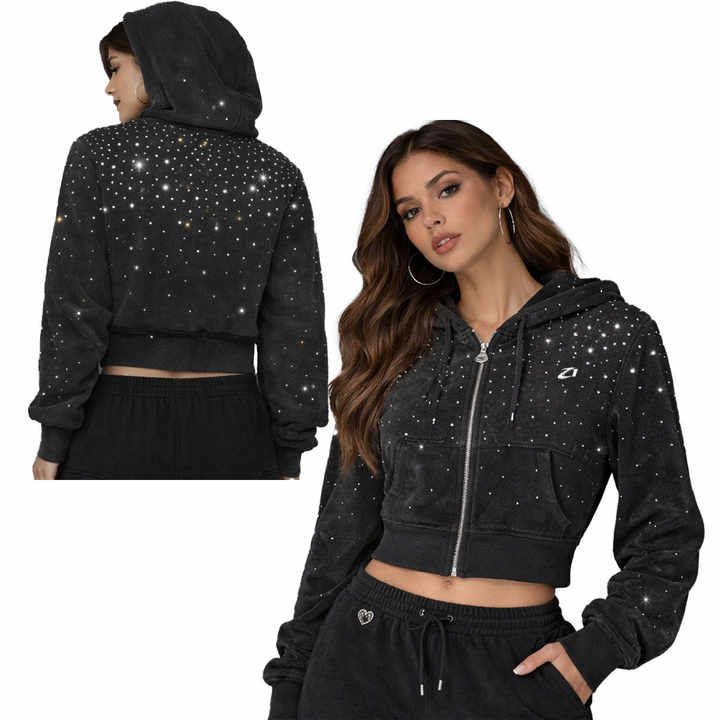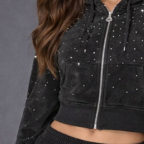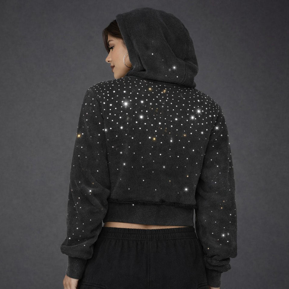 เสื้อฮู้ดครอปซิป OEM ประดับคริสตัลทั้งตัว ผ้าคอตตอนเทอร์รี่ 450GSM ทรงโอเวอร์ไซส์ ไหล่ตก สไตล์สตรีทแวร์ มีซับใน ซิปแบบสั่งทำพิเศษ