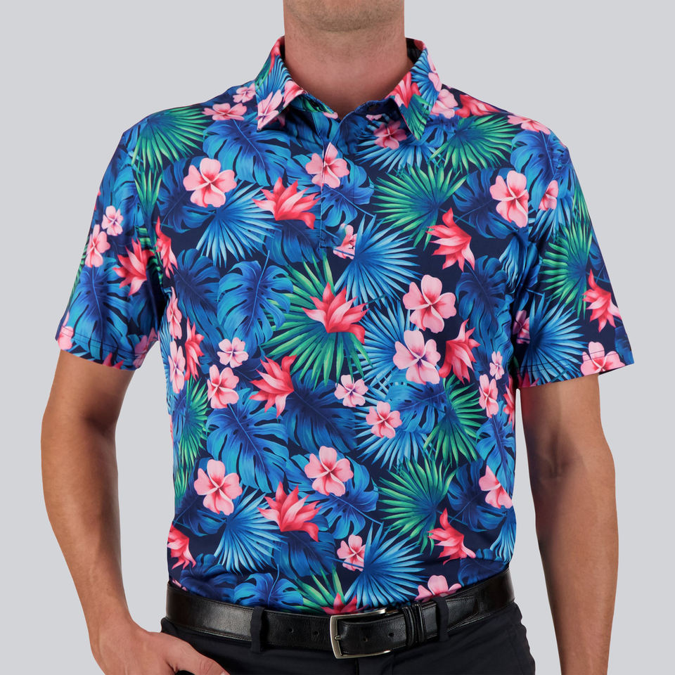 เสื้อโปโลกอล์ฟ OEM พิมพ์ลายทั้งตัว 90% โพลีเอสเตอร์ 10% สแปนเด็กซ์ พร้อมออกแบบปกเสื้อ โลโก้ และงานปักตามสั่ง