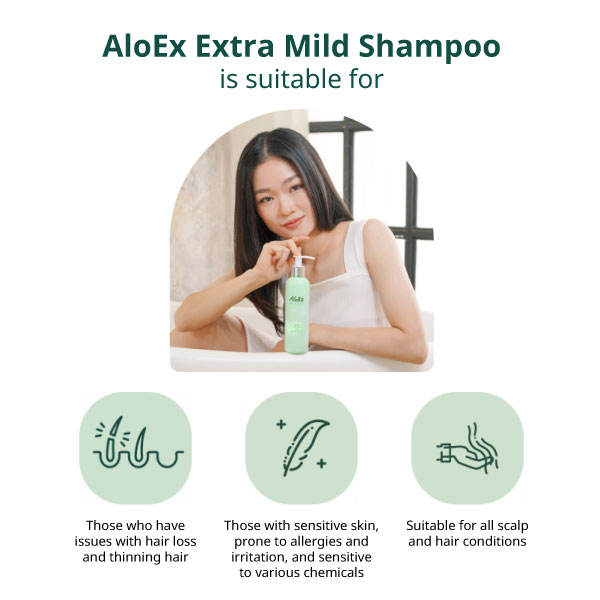 แชมพู OEM AloEx สูตรอ่อนโยนพิเศษ ลดการชี้ฟู ขจัดรังแค บำรุงผมให้นุ่มลื่น สดชื่น ชุ่มชื้น บำรุงล้ำลึก ปราศจากซิลิโคน ควบคุมความมัน