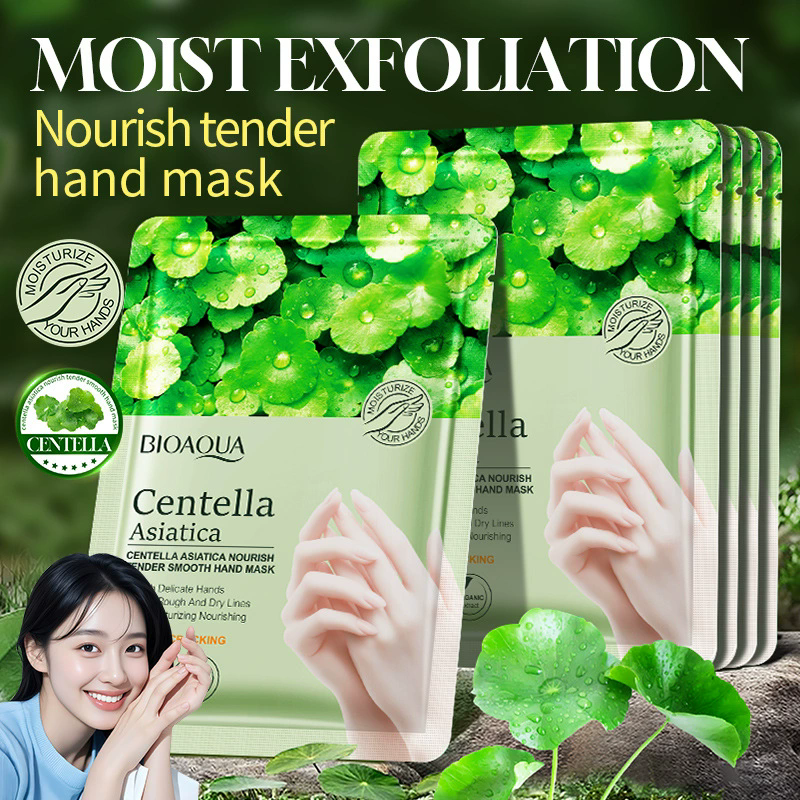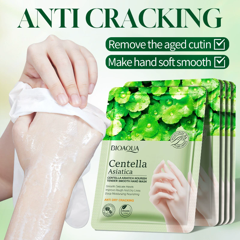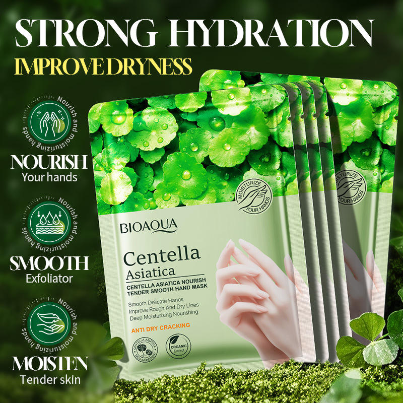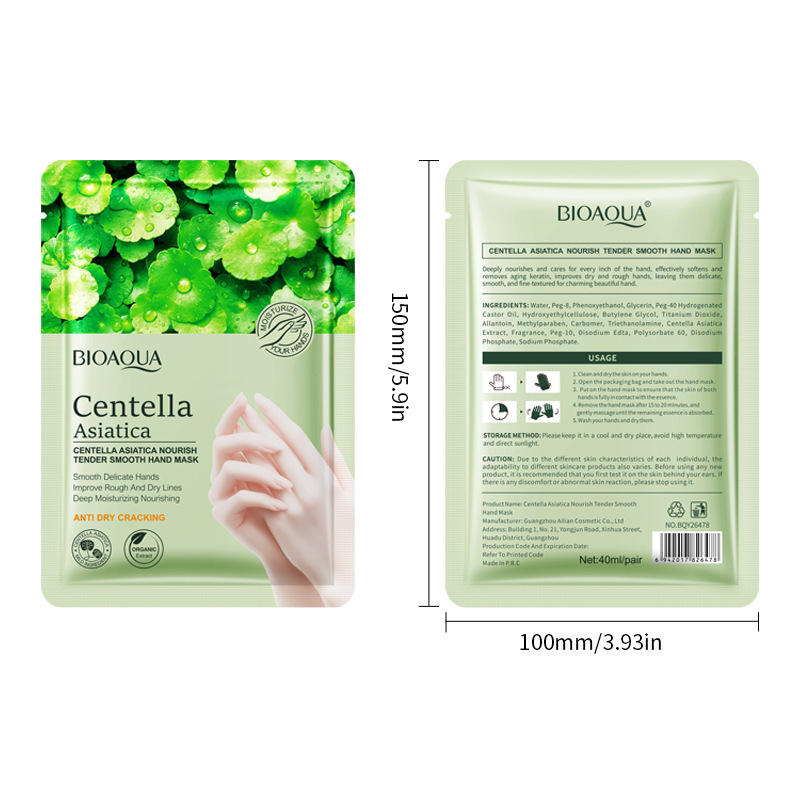 OEM BIOAQUA ขายส่งแผ่นมาส์กมือผลิตจากใบบัวบก ช่วยผลัดเซลล์ผิวอย่างเป็นธรรมชาติ ช่วยให้ผิวขาวกระจ่างใส นุ่มละมุน สำหรับมือ