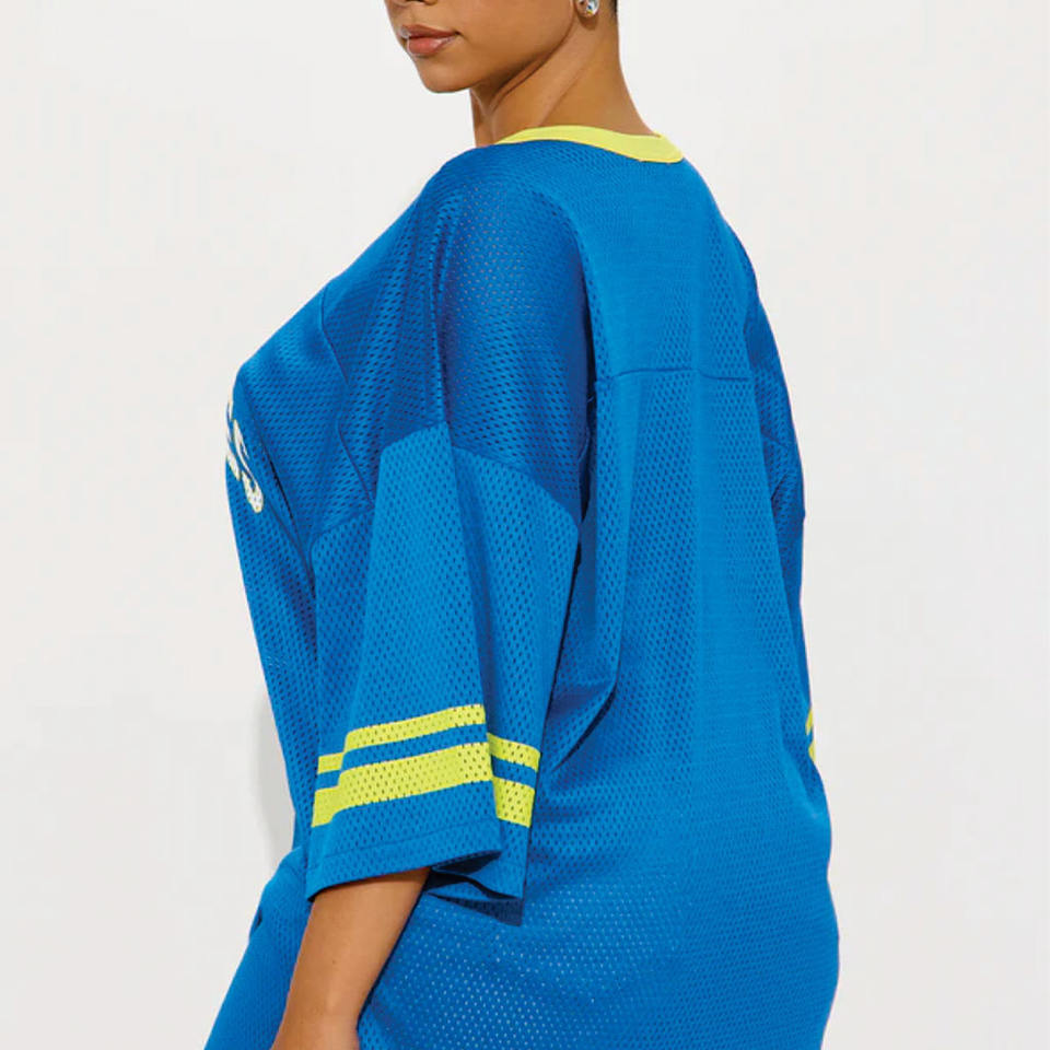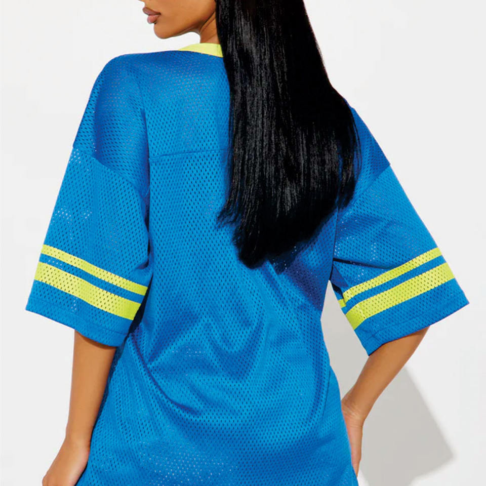 เสื้อเจอร์ซีย์อเมริกันฟุตบอลสีน้ำเงินเหลืองแบบโอเวอร์ไซส์สำหรับทุกเพศ ผลิตโดย OEM ทำจากผ้าฝ้าย เหมาะสำหรับใส่เล่นกีฬา ขายส่งเสื้อทีมฟุตบอล