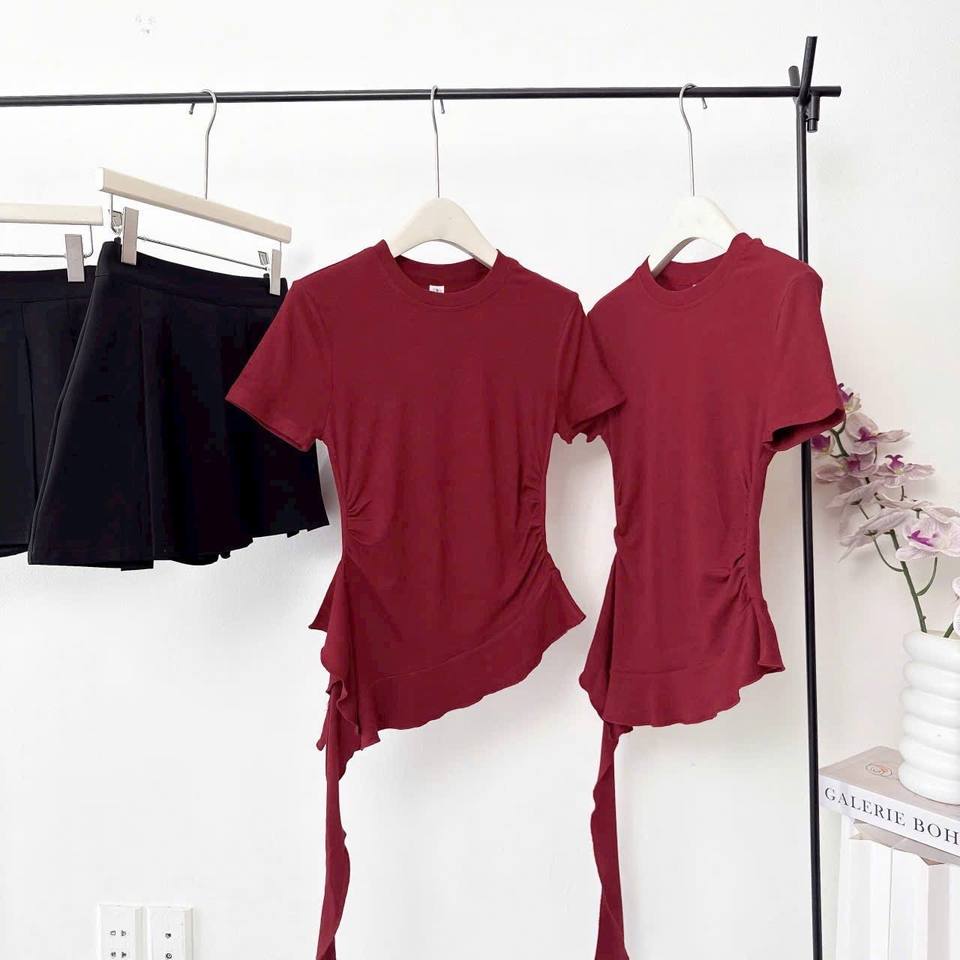 ชุดเซ็ตเสื้อยืดทรงเข้ารูปสีเบอร์กันดีแบบ OEM พร้อมกระโปรงมินิสั้นจีบสำหรับผู้หญิง