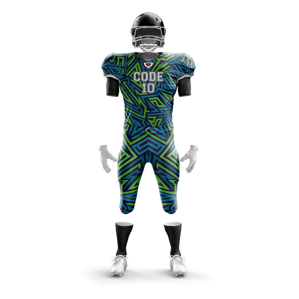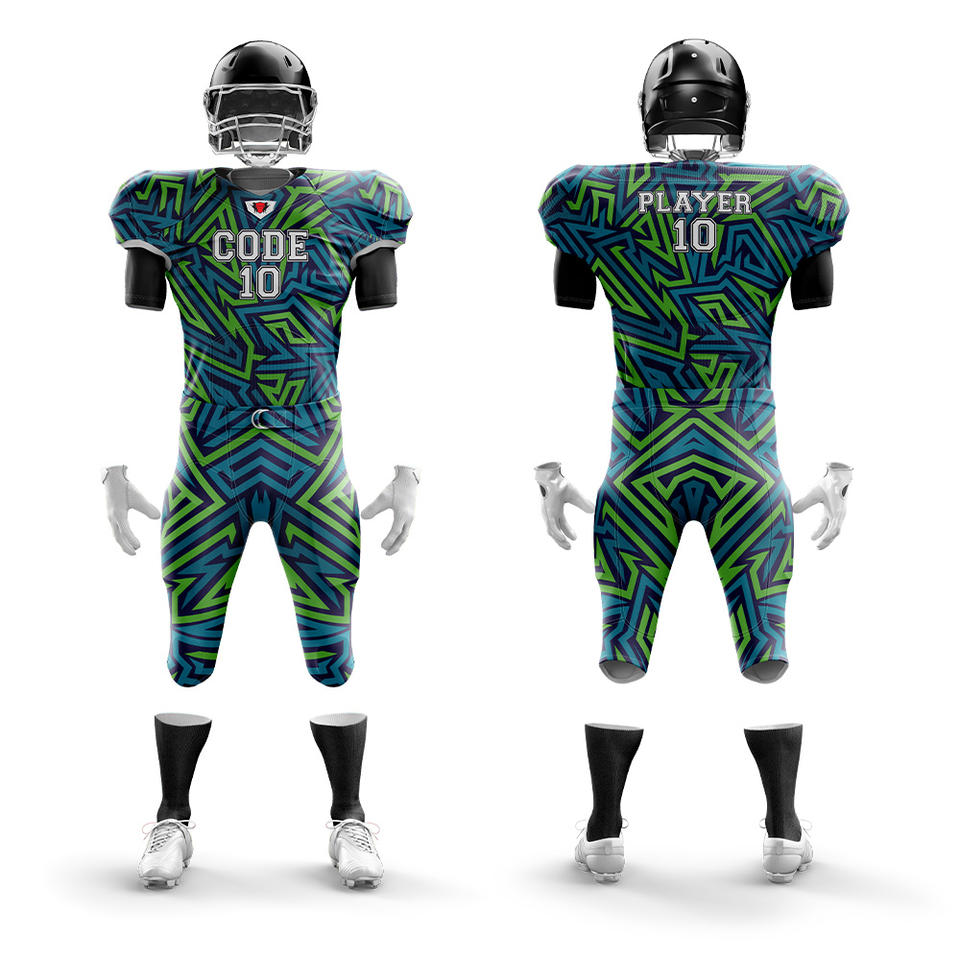 ชุดทีมฟุตบอลอเมริกัน OEM CODE TEXTILES AF-012 คุณภาพสูง ปี 2025 ผลิตจากโพลีเอสเตอร์ 100% ระบายอากาศได้ดี มีไซส์พลัส พร้อมลายพิมพ์แบบ Heat-Transfer