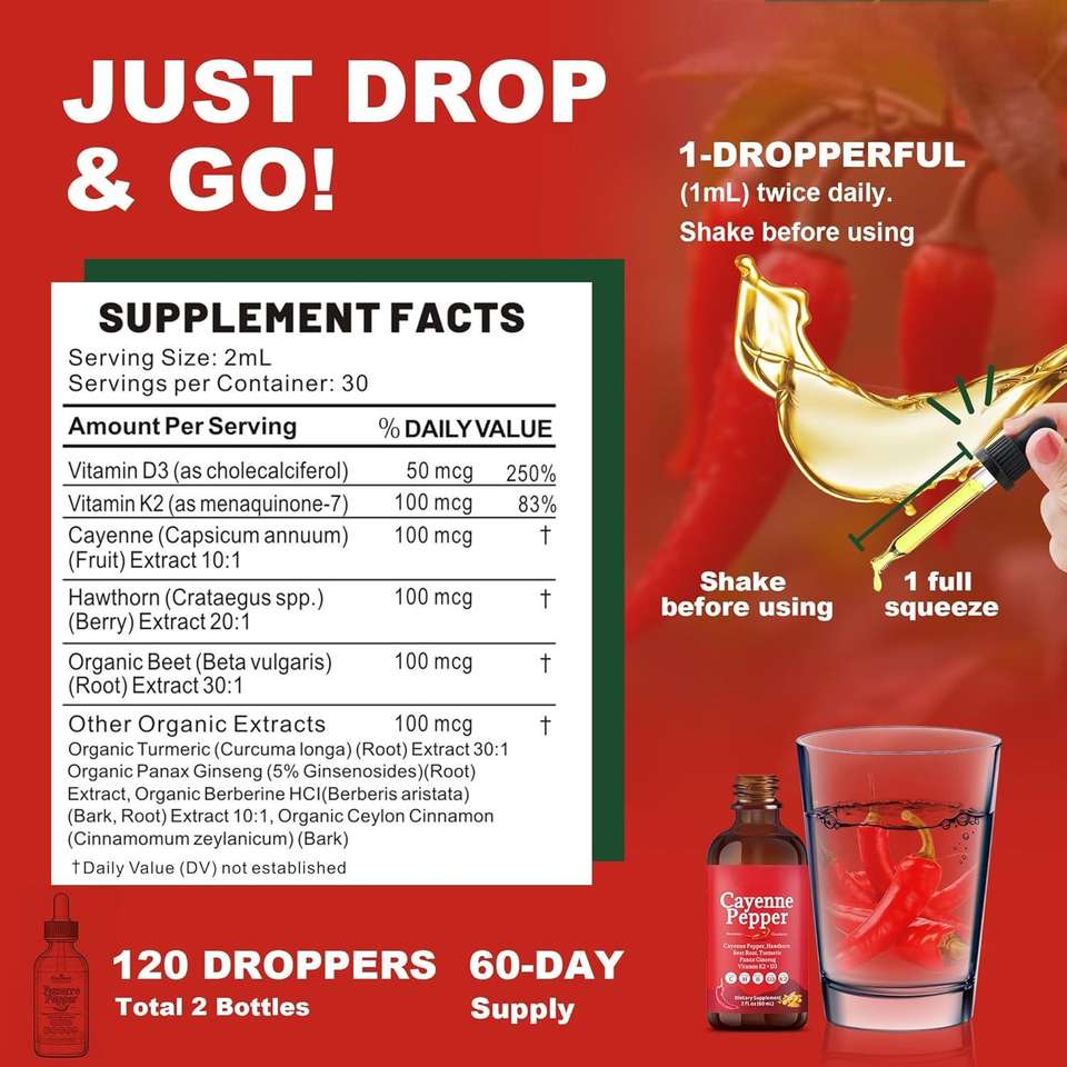 โออีเอ็ม คาเยนน์ ดรอปส์ แคปไซซินเหลวบริสุทธิ์ อาหารเสริมเพื่อสุขภาพภูมิคุ้มกันและระบบเผาผลาญ 2 ออนซ์